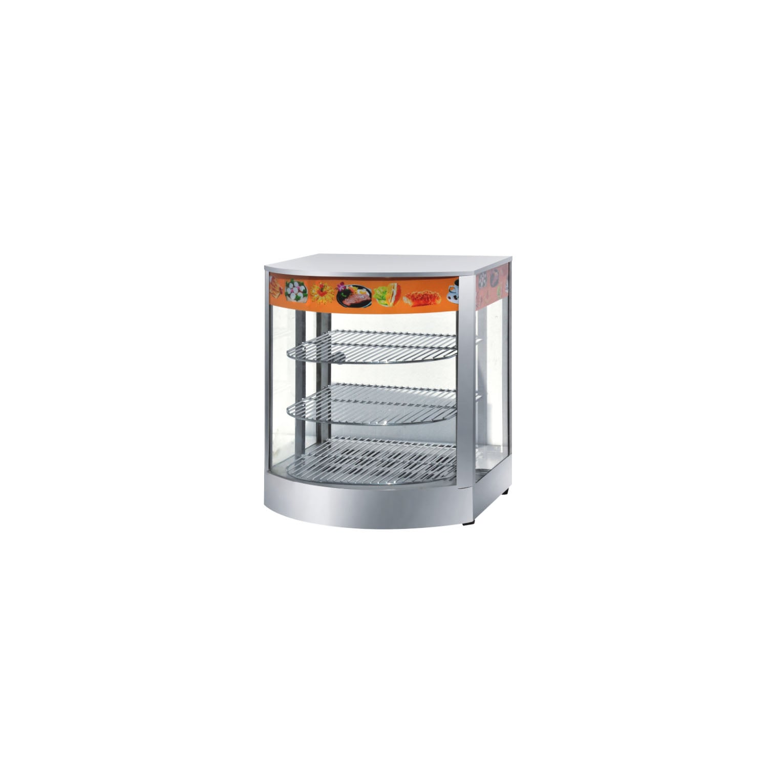 The unit features a curved front glass panel that offers an unobstructed view of the contents. This design allows customers to clearly see cakes and hot snacks from multiple angles without opening the door. Clear visibility helps staff monitor stock levels and encourages selection in high-traffic areas like concession stands.