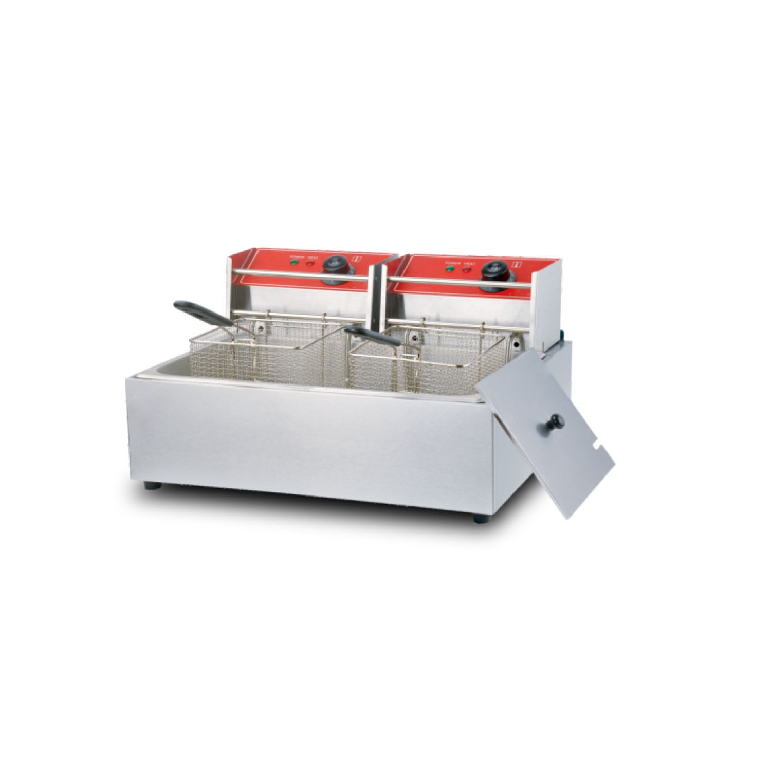 Independent manual thermostats allow precise temperature regulation for specific frying requirements. Clear power and heat indicator lights provide immediate visual status updates, streamlining operation for kitchen staff.