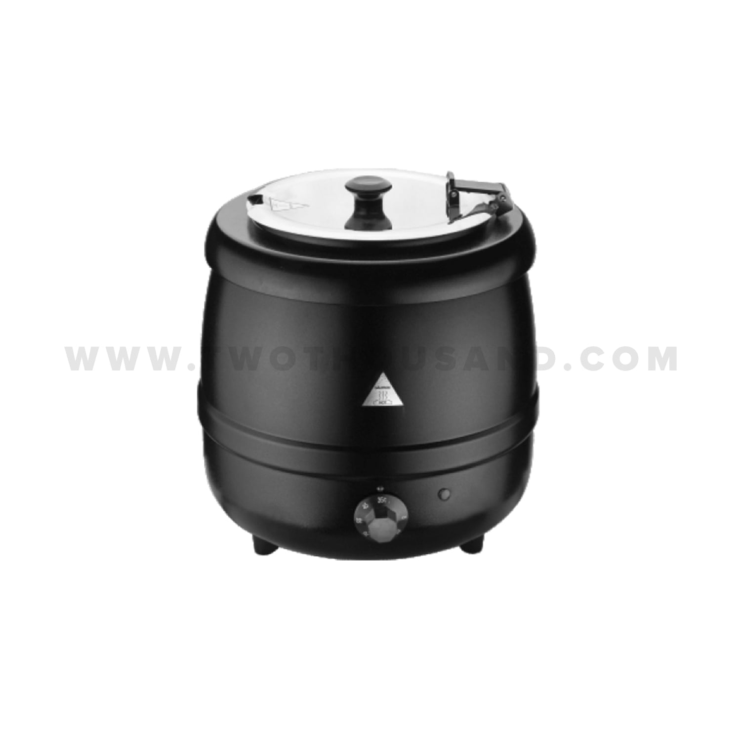 The TT-K3 Electric Soup Kettle Warmer maintains the serving temperature of soups, sauces, and stews. With a 10-liter capacity, this unit serves high-volume buffets and catering lines without frequent refills. The compact black exterior fits standard countertop arrangements, allowing staff to position it easily near service points for immediate access.