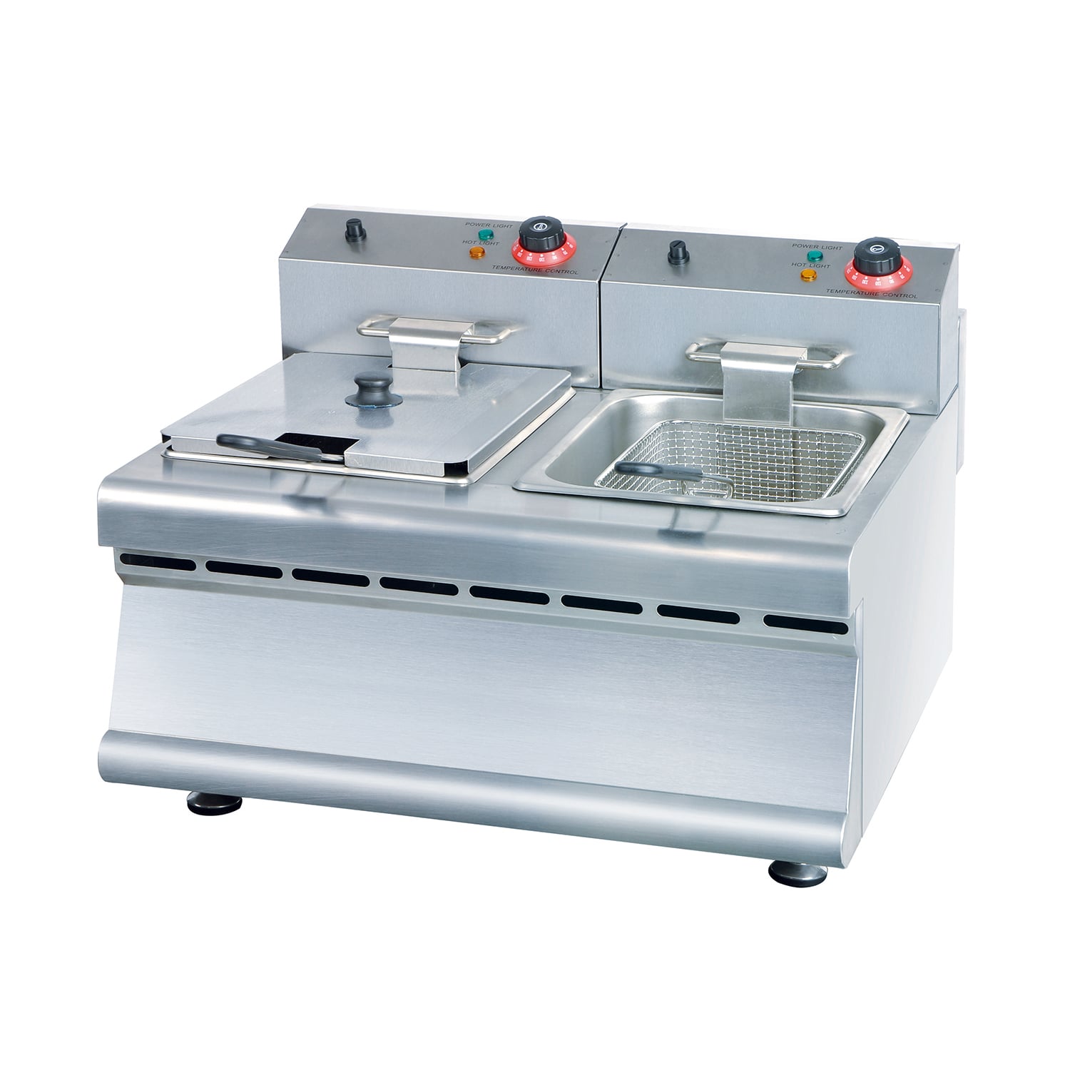This dual-tank electric fryer fits on crowded countertops while handling distinct menu items simultaneously. With two independent 8-liter tanks, chefs can fry fish and chips separately to prevent flavor transfer. The stainless steel body withstands heavy daily use in busy snack bars and fast-food kitchens.