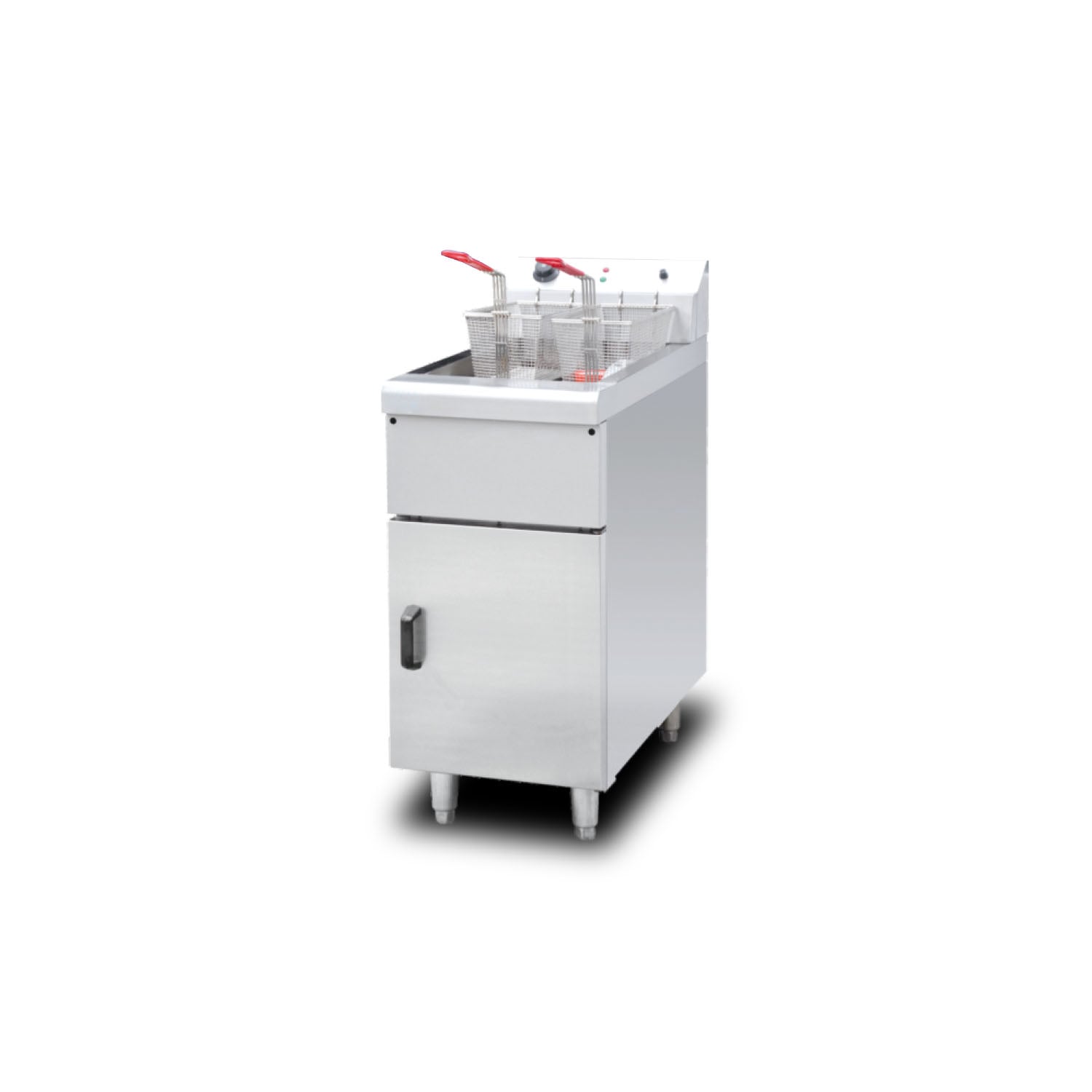 The enclosed cabinet base utilizes vertical space efficiently in the kitchen layout. It provides a designated area to store oil containers, filtration supplies, or cleaning tools, keeping the workstation organized. The door conceals these items from view, maintaining a clean appearance in open kitchen environments.