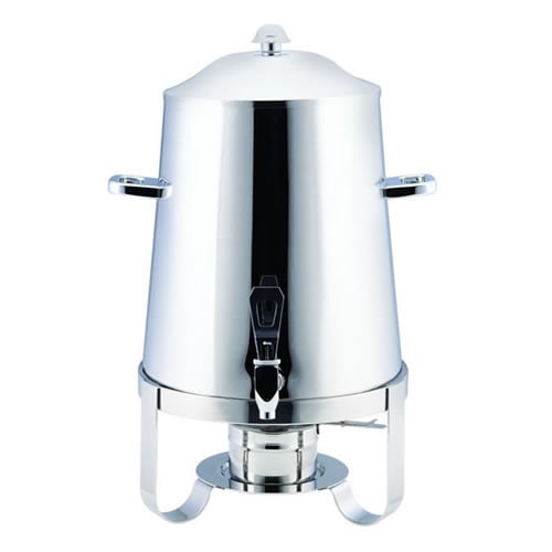 This stainless steel coffee chafer urn maintains the serving temperature of hot beverages during catering events. The vertical design fits on crowded buffet tables, allowing guests to serve themselves coffee or tea. Its durable construction withstands frequent transport and daily use in hotels and banquet halls.