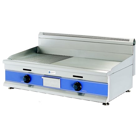 The 1000 x 400 mm plate features a flat side and a grooved grill side. Cooks prepare eggs, pancakes, or vegetables on the flat griddle while searing steaks, chicken, and burgers on the grooved section. This split design enables the kitchen to handle mixed orders rapidly during peak service hours.