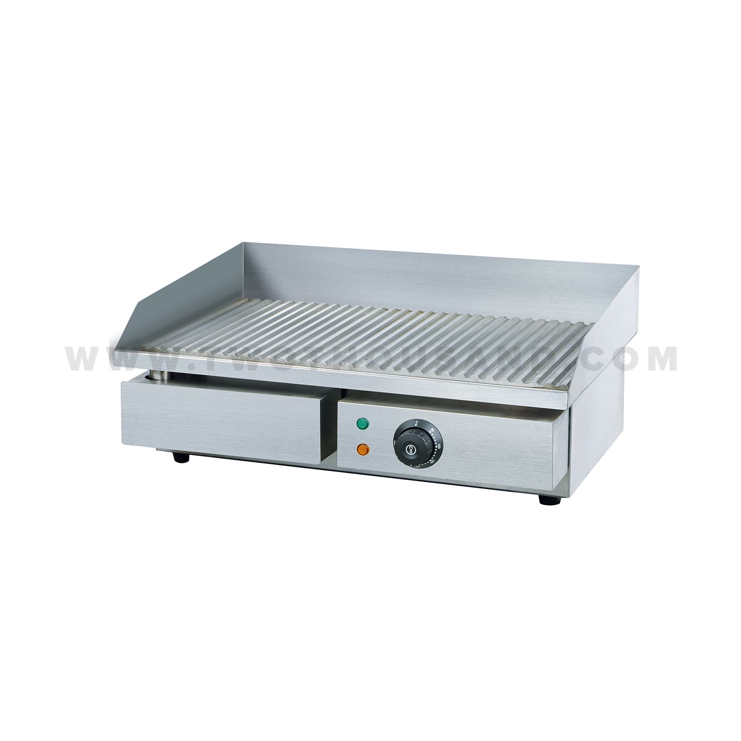 A powerful 3KW element brings the griddle to operating temperature quickly. It provides sufficient energy to sear thick cuts of meat rapidly, locking in juices. The precise temperature control allows the operator to adjust heat levels for different tasks, from toasting buns to searing steaks.