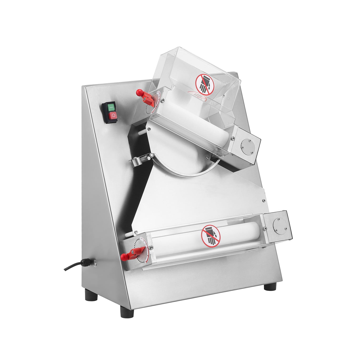 A 370W motor drives the rolling mechanism, processing dough balls rapidly. This power output handles stiff pizza dough without stalling, maintaining a steady workflow during lunch or dinner rushes. The motor runs quietly, allowing kitchen staff to communicate clearly while the machine operates.