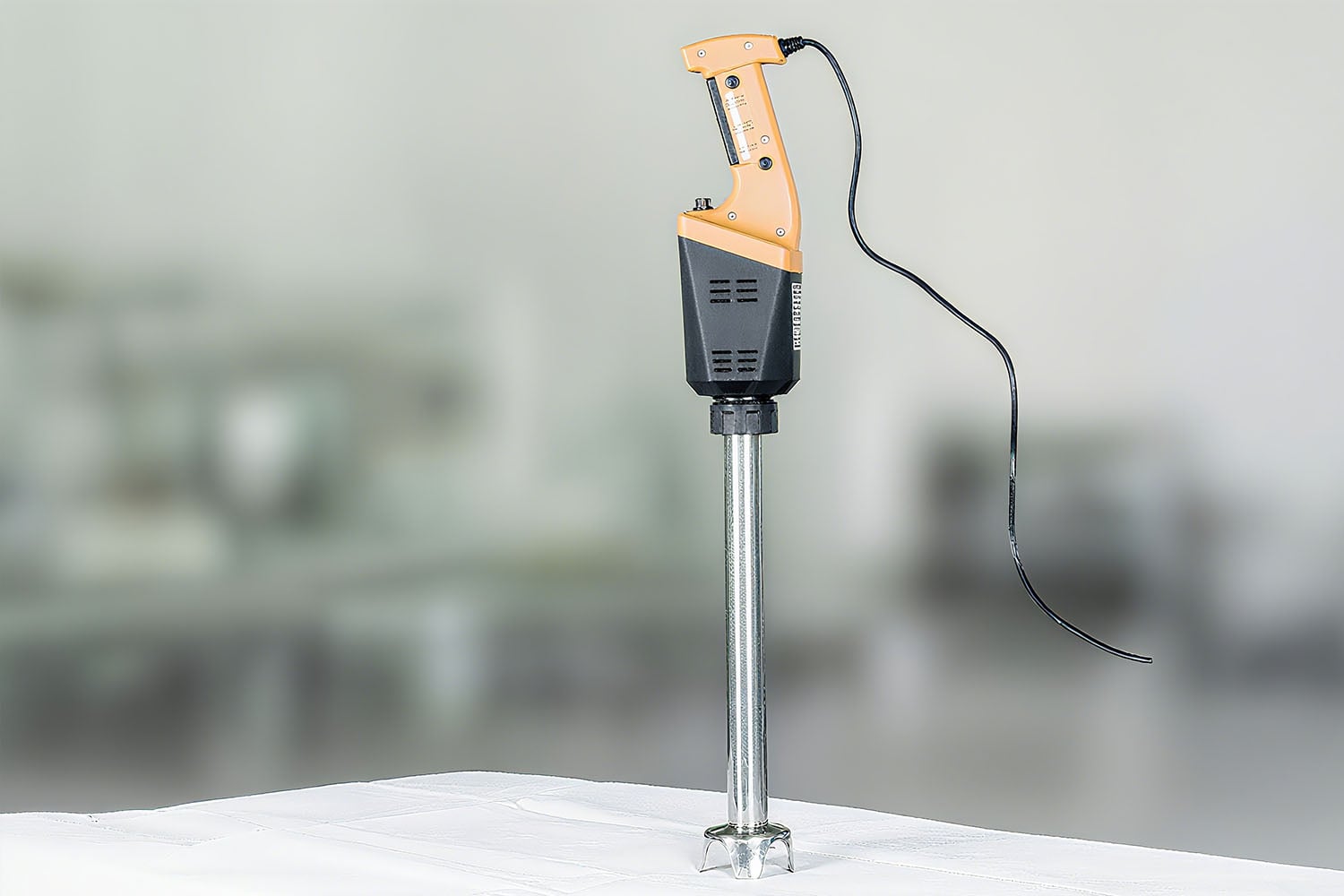 Holding a trigger for long periods causes hand fatigue during high-volume production. The locking button secures the blender in the “on” position without constant pressure from the operator. This feature allows the chef to focus on guiding the mixer through the pot, improving efficiency when processing large batches.