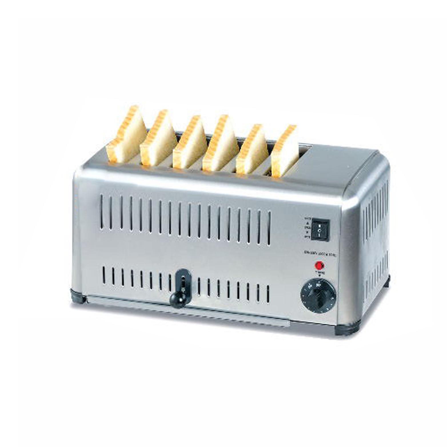 This 6-slice electric toaster handles high-volume breakfast service demands. Designed for hotel buffets and busy cafes, it toasts multiple slices simultaneously to reduce customer wait times. The compact body fits easily on crowded countertops, providing consistent browning for standard sandwich bread without occupying excessive space.