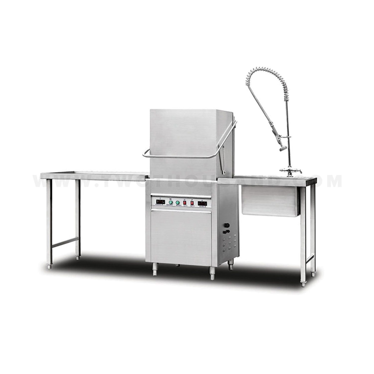 The TT-K130 Hood Type Commercial Dishwasher supports high-volume cleaning in commercial kitchens. With a capacity of 60 baskets per hour, this machine maintains workflow during peak service. The pass-through design connects with inlet and outlet tables, allowing staff to slide racks through for rapid loading and unloading of plates, glasses, and cutlery.