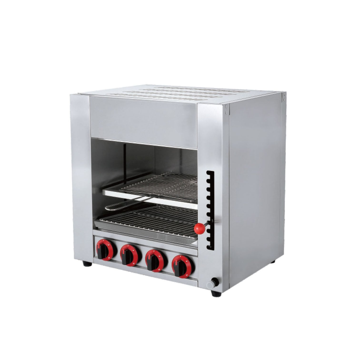 The salamander is equipped with individual control knobs for each burner. This allows the operator to manually adjust the heat intensity for different zones, enabling precise temperature management for various food items being processed simultaneously.