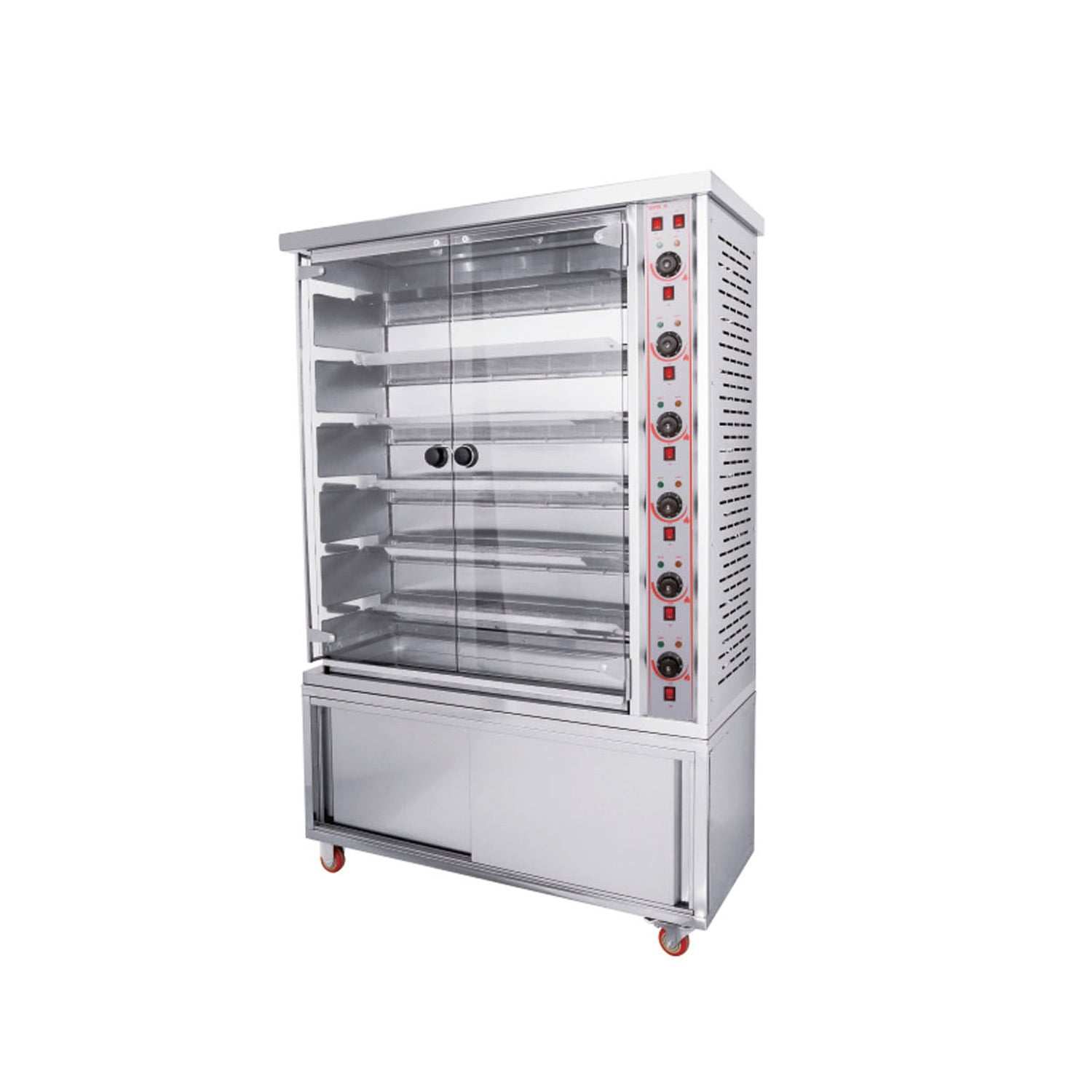 The integrated cabinet at the base of the unit provides storage for necessary items like utensils and seasonings. This design optimizes the use of kitchen floor space, a consideration for businesses with limited operational areas. Some rotisserie models also include warming cabinets to hold the finished product.