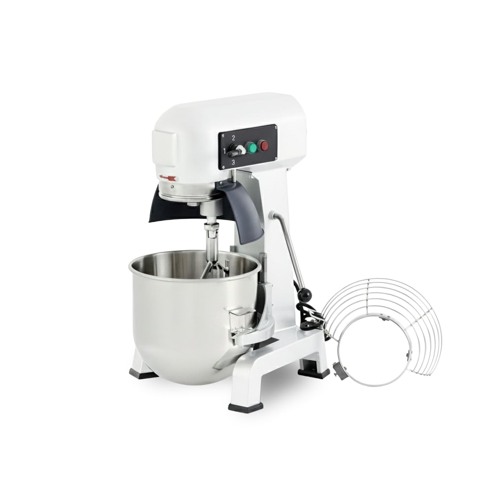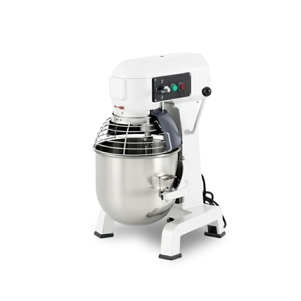 The EC20 Commercial Planetary Mixer handles heavy mixing tasks in professional kitchens with precision and stability. Equipped with a powerful 1100W motor, this gear-driven machine maintains consistent torque for thick mixtures, ensuring uniform texture. The 20-liter stainless steel bowl accommodates up to 7.5 kg of flour or manages 5.0 kg of heavy kneading tasks per batch. Weighing 56 kg, the unit sits firmly on the countertop or stand, reducing vibration during high-speed operation.