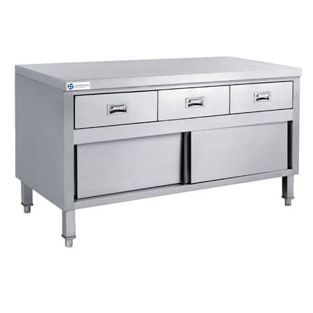 The TT-BC320B Stainless Steel Kitchen Work Cabinet provides a dedicated 1500mm prep station with built-in storage. Designed for commercial kitchens, this unit combines a flat work surface with three drawers and an enclosed lower cabinet. It keeps your tools organized and your ingredients protected from grease, helping kitchen staff maintain a clean and structured workflow.