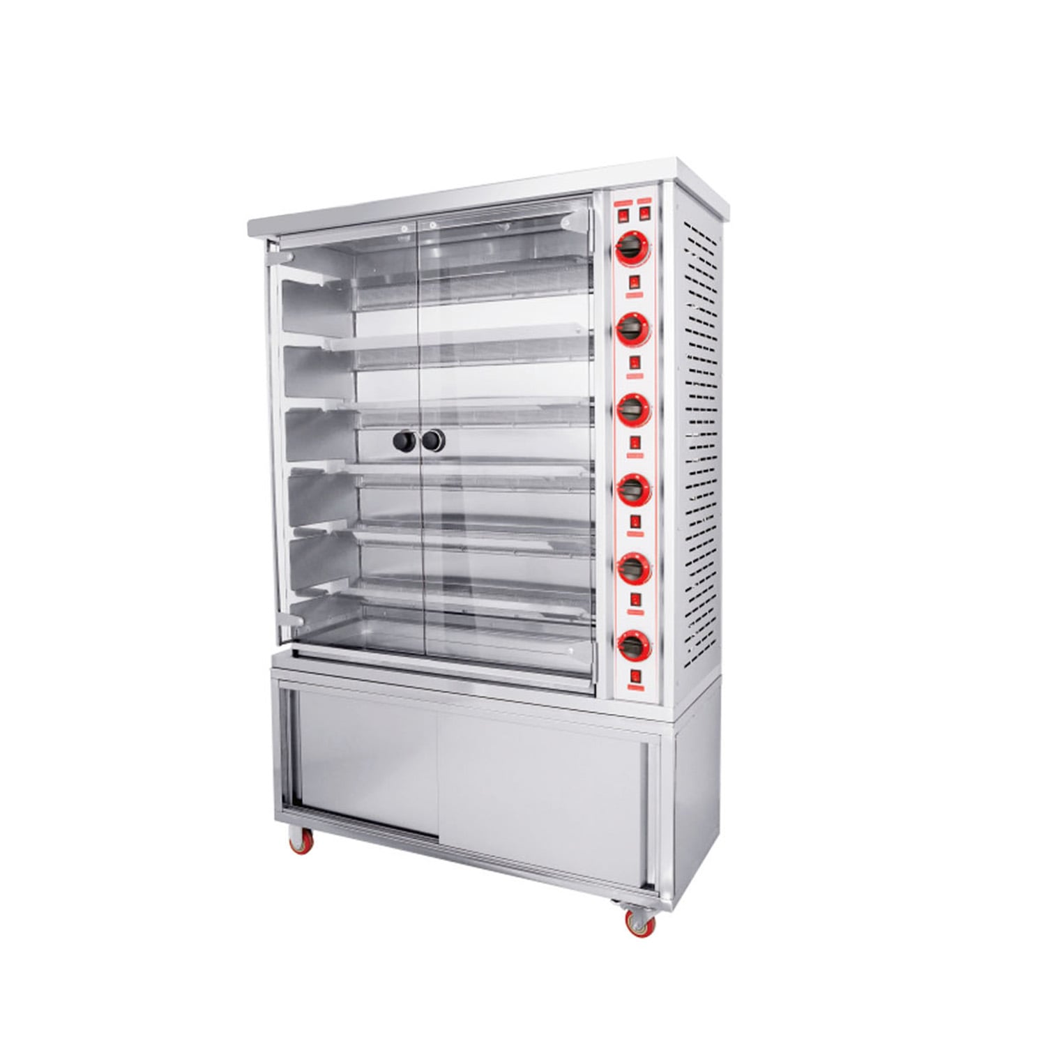 The oven is equipped with a motorized mechanism that automates the rotation of the spits. This function ensures continuous, hands-free cooking. The rotation facilitates even heat distribution and self-basting of the chickens, contributing to a consistent final product without manual intervention.