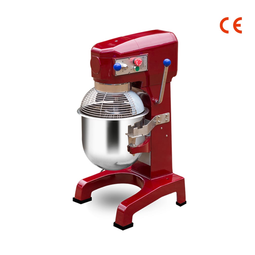 This planetary mixer features a new top head design that includes all necessary buttons and switches for adjusting speed. It comes in two stylish colors: red and gray.